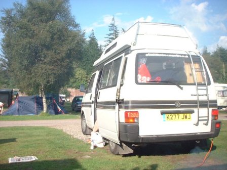 Het plekje op de foto boven was onze uiteindelijke plaats. We stonden eerst boven aan op een heuvel maar vonden het er niet echt prettig. Dus wandelden we wat rond op deze enorme camping en vonden het plekje hierboven.Toen we terug kwamen bij de camper kregen we hem niet weg van wege de nattigheid. We konden alleen maar achteruit, maar daar stond de auto van de buurtent geparkeerd. Dus moesten we de buurtent-bewoner gaan zoeken, die was niet in zijn tent. Gelukkig was ie makkelijk te vinden en nadat we hem vroegen zijn auto weg te halen konden we achteruit van het natte plekje af en zo naar ons nieuwe plekje.