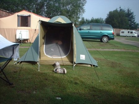 Dus zetten we de tent op voor Lotte. Het weer was geweldig, warm en zonnig. We liepen naar het plaatselijke postkantoor, wat ook fungeerde als dorpswinkel, dorps-internet toeganspunt en de locale slijterij. We kochten daar wat voedsel voor ons middag en avondeten.Toen we terug waren op de camping sloeg het weer om. Het begon te regenen en voor dat we er erg in hadden stortte het neer. Gelukkig hadden we ook wat kranten en tijdschriften gekocht dus konden we de tijd doorbrengen met lezen.
